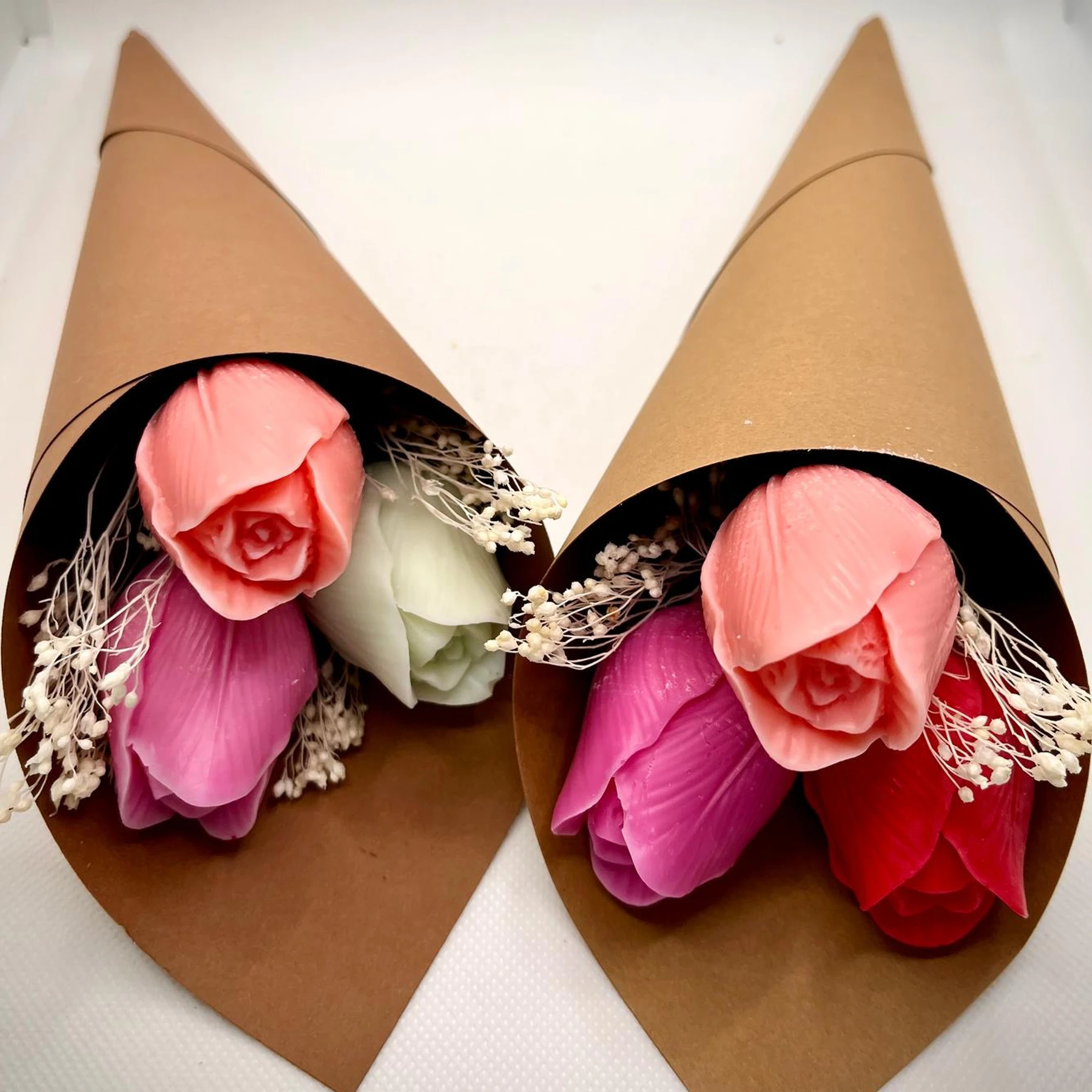Descoperă eleganța unui buchet de lalele din ceară de soia naturală, realizat handmade cu atenție la fiecare detaliu. Acest aranjament delicat îmbină frumusețea florilor cu rafinamentul unui produs artizanal premium, fiind alegerea perfectă pentru cadouri speciale sau decor interior modern. Fiecare lalea este modelată manual din ceară de soia 100% naturală, eco-friendly, oferind un aspect realist și o textură fină. Buchetul este ambalat în hârtie kraft minimalistă, completat de accente decorative naturale, pentru un design elegant.